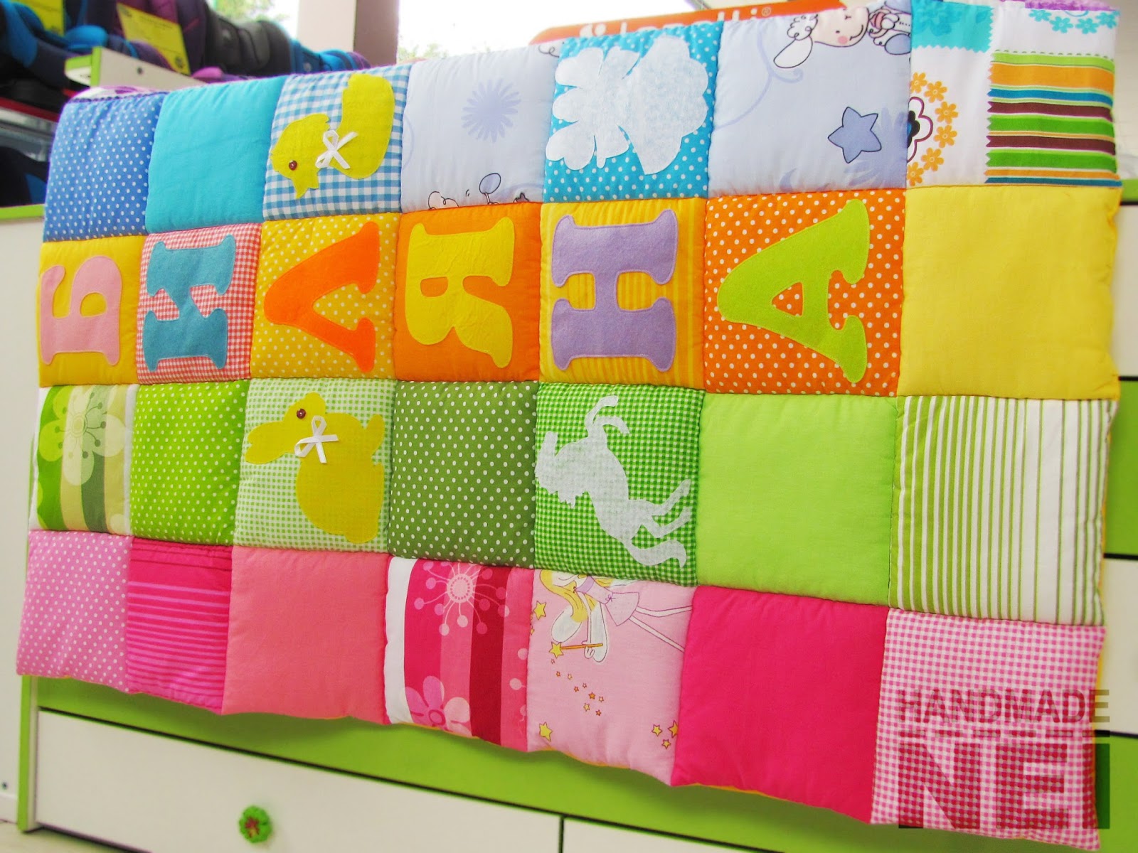 Името и апликацийте са изработени от цветен филц и сатенена панделка.